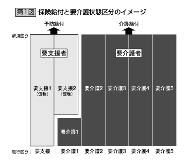 厚生労働省が示す新「予防給付」のイメージは第1図のとおりで、現行の要支援のすべてと、要介護1のかなりの部分が、新しく介護予防の対象となり、従来の介護給付に代えて、予防給付が行われることとなる。要介護1に残るのは、認知症の人など、介護予防になじまない人たちである。予防給付の中核は、リハビリ(筋力向上)、栄養改善及び口腔機能向上の3つで、現行の家事援助などは、当事者の自助の意欲を失わせないという観点から、厳しく見直されることとなる。
